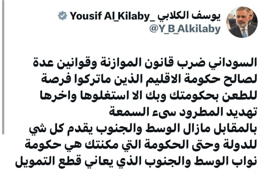 وقال الكلابي في تغريدة تابعتها "المطلع"، إن:"الإقليم لم يترك فرصة للطعن بالحكومة وبالسوداني شخصياً إلا واستغلها، وآخرها ما وصفه بـ"تهديد المطرود سيئ السمعة".